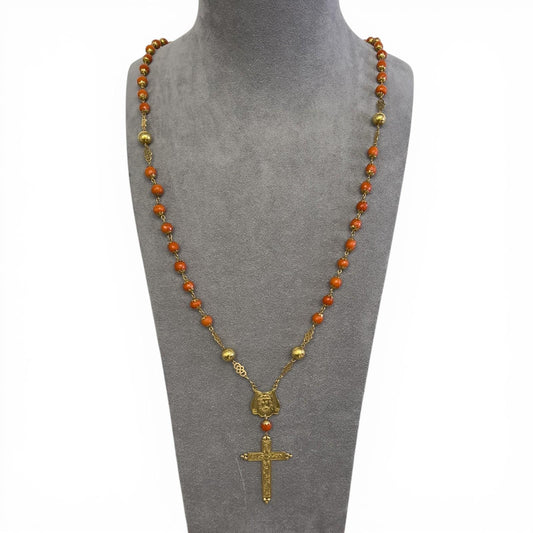 Vintage 16k Yellow Gold Coral Faceted Briolette Rosary Cross Necklace 51g 34"
